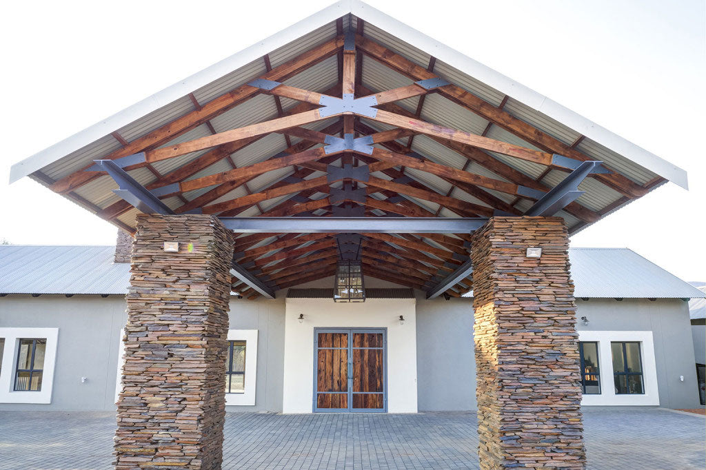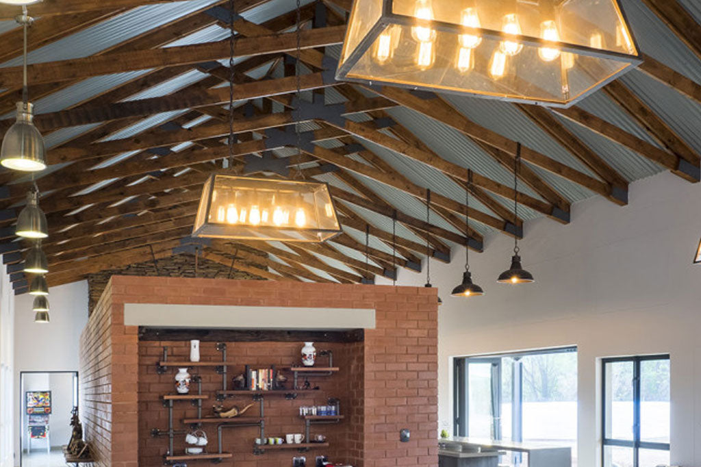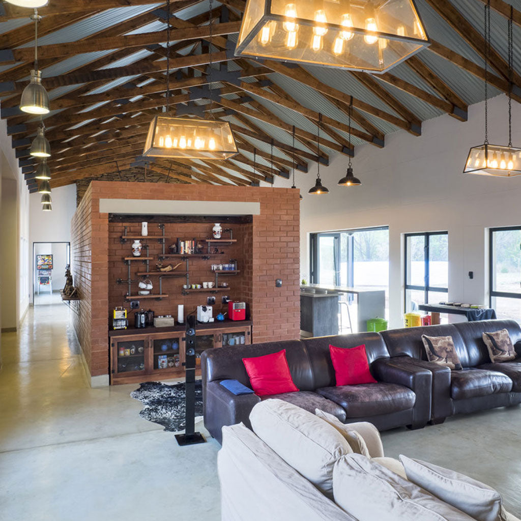 The owners love to entertain and the structure was designed to suit their personalities and life-style combined with the stunning natural surrounds. The use of stone cladding, polished concrete, face-brick, wood, open rafters and high windows add to the ‘bush lodge feel’ of this sprawling residence. The kitchen is a particular design feature as an accentuated face brick cube within the massive barn-like structure of the open-plan double volume living space.