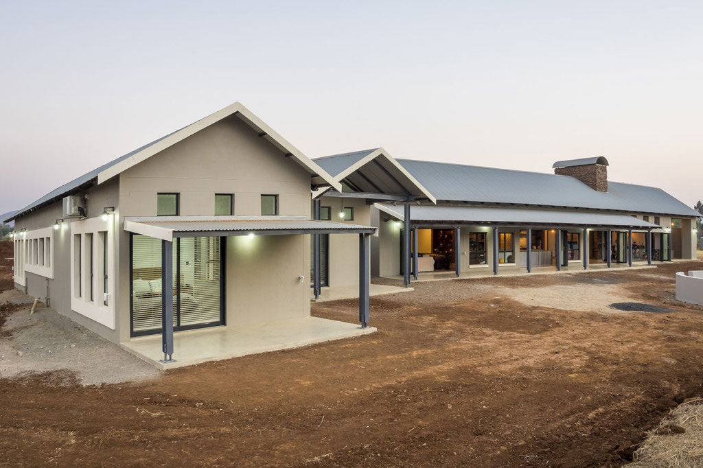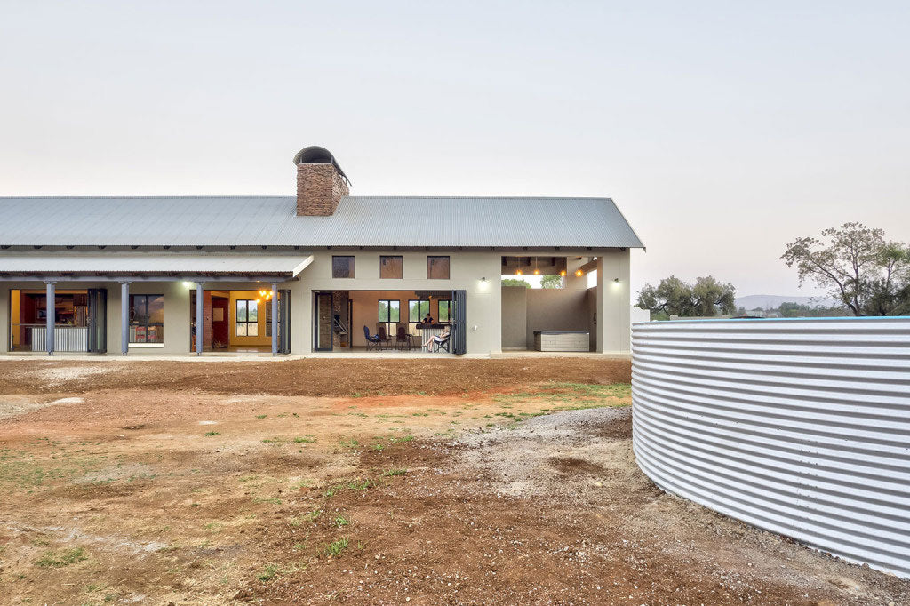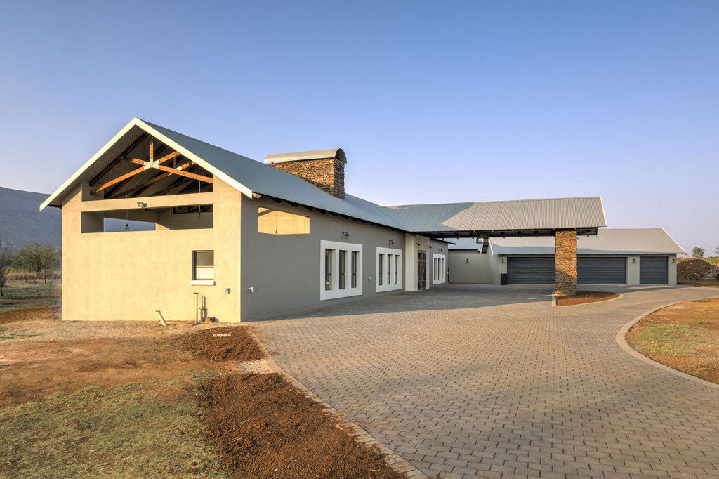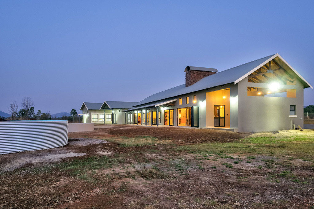 This opulent residential home is situated near Hartebeespoort Dam on a smallholding with indigenous bush and a feeling of rustic farm living. It is the epitome of inside outside living with effortless flow from the fire-pit and farm dam swimming pool into the bar area, massive double-sided fireplace, unique kitchen cube and open, double volume spaces inside.